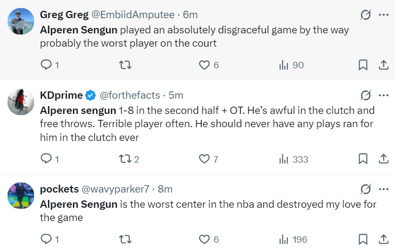 但火箭球迷们纷纷朝着申京开炮:1.比赛进入加时申京就不该登场,下一场比赛让他坐在板凳席吧。